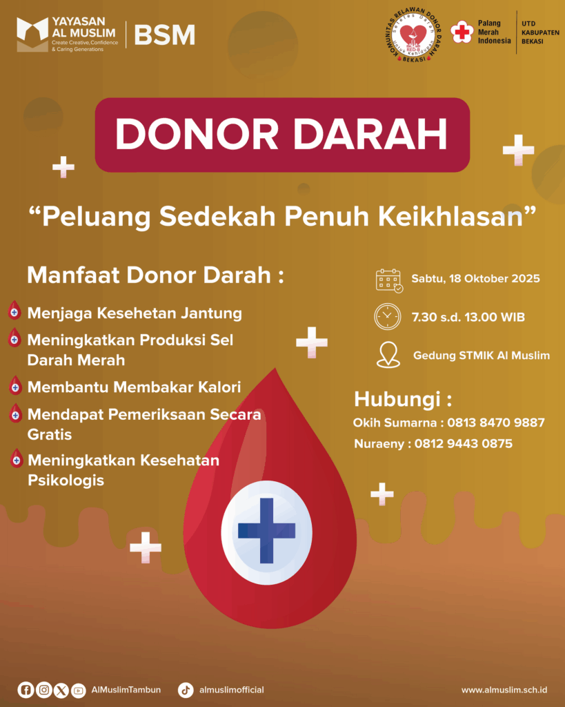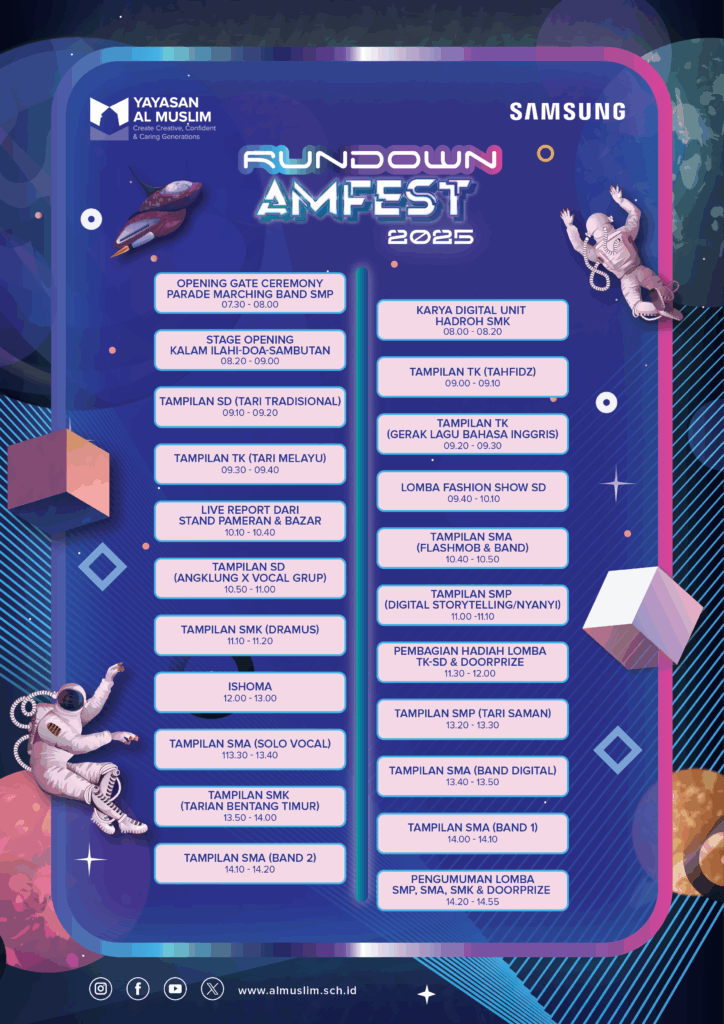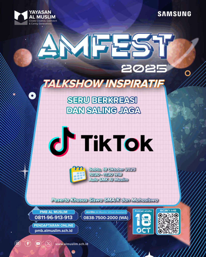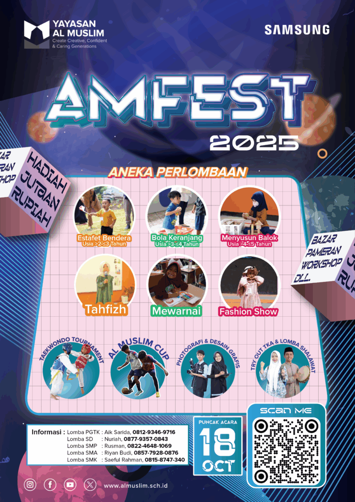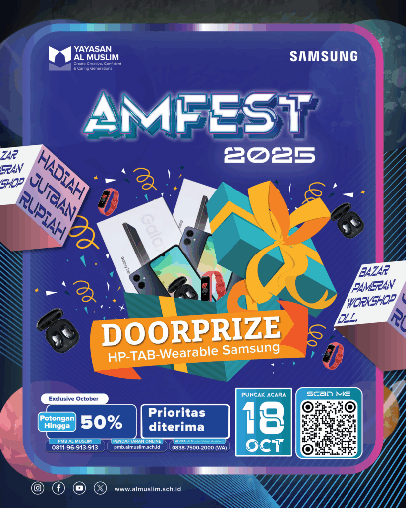 Al Muslim Festival 2025 #ASIKnyaSekolahdiAlMuslim Pada 11 Oktober 2024, Al Muslim akan melaksanakan kembali kegiatan Al Muslim Festival (AM FEST).Berbagai kegiatan menarik akan dilaksanakan sepanjang Bulan Oktober mendatang. Apa saja kegiatannya? Simak rangkaiannya berikut ini. AL MUSLIM rangkaian perlombaan AMFEST 2025 AL MUSLIM Roundown Kegiatan Amfest 2025 AL MUSLIM talkshow inspiratif Amfest 2025 AL MUSLIM talkshow inspiratif amfest 2025 AL MUSLIM doorprize amfest 2025 AL MUSLIM Donor Darah amfest 2025