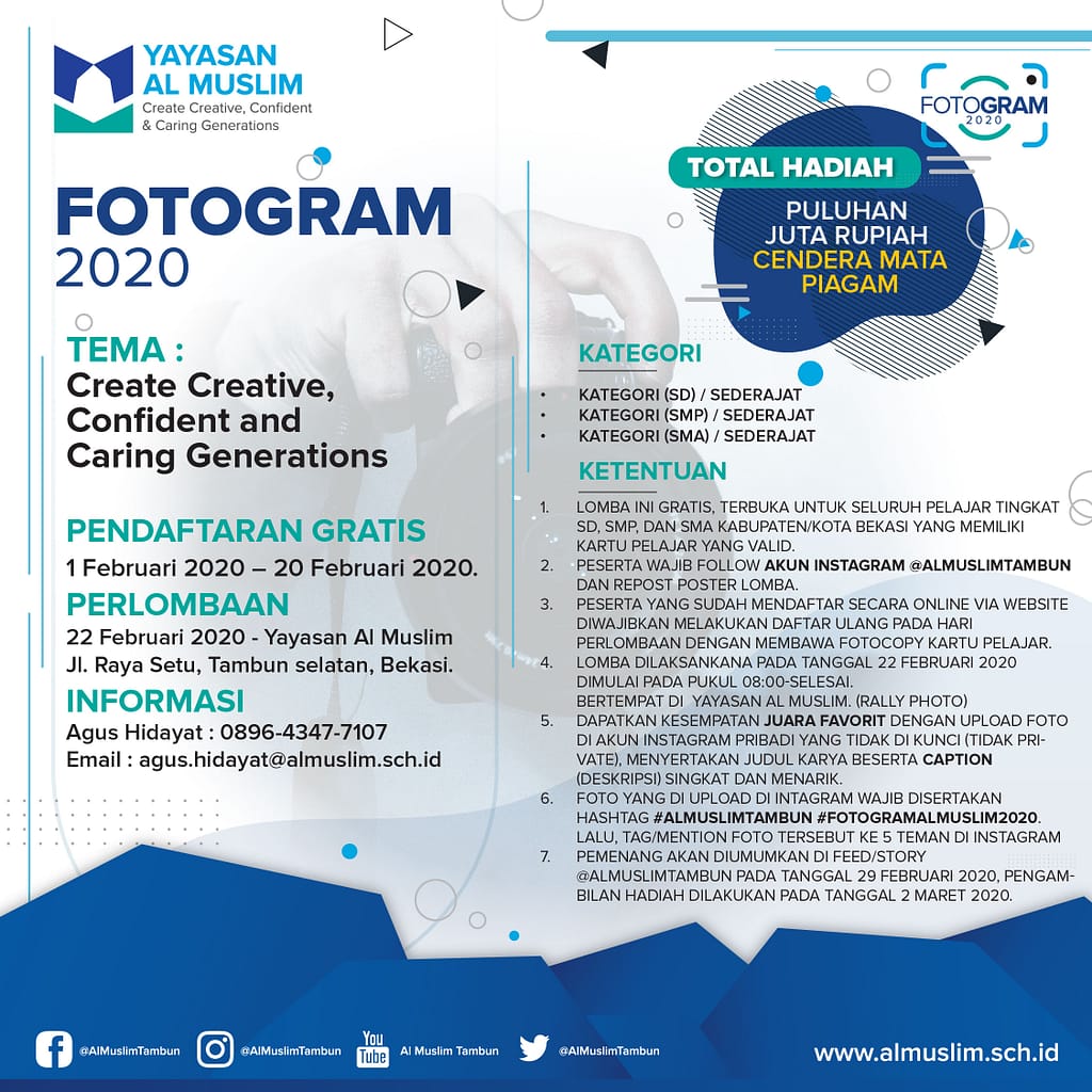 Beranjak dari hal tersebut Yayasan Pendidikan Al Muslim mencoba mengambil bagian dari diskursus dunia fotografi dengan menyelenggarakan kegiatan lomba fotografi tingkat Kabupaten/Kota Bekasi. Tentu saja kegiatan ini bukan merupakan event pertama dalam komunitas fotografi, namun demikian merupakan salah satu upaya untuk mengisi ruang-ruang kosong agar para pencinta fotografi dapat menyalurkan hobi sekaligus berkompetisi. Tema yang akan diangkat dalam kompetisi kali ini “Create Creative, Confident and Caring Generations”. Tema ini memiliki makna yang dalam sekaligus menantang bagi pecinta fotografi untuk dapat memvisualisasikannya dalam bentuk foto yang diambil dalam berbagai dimensi.